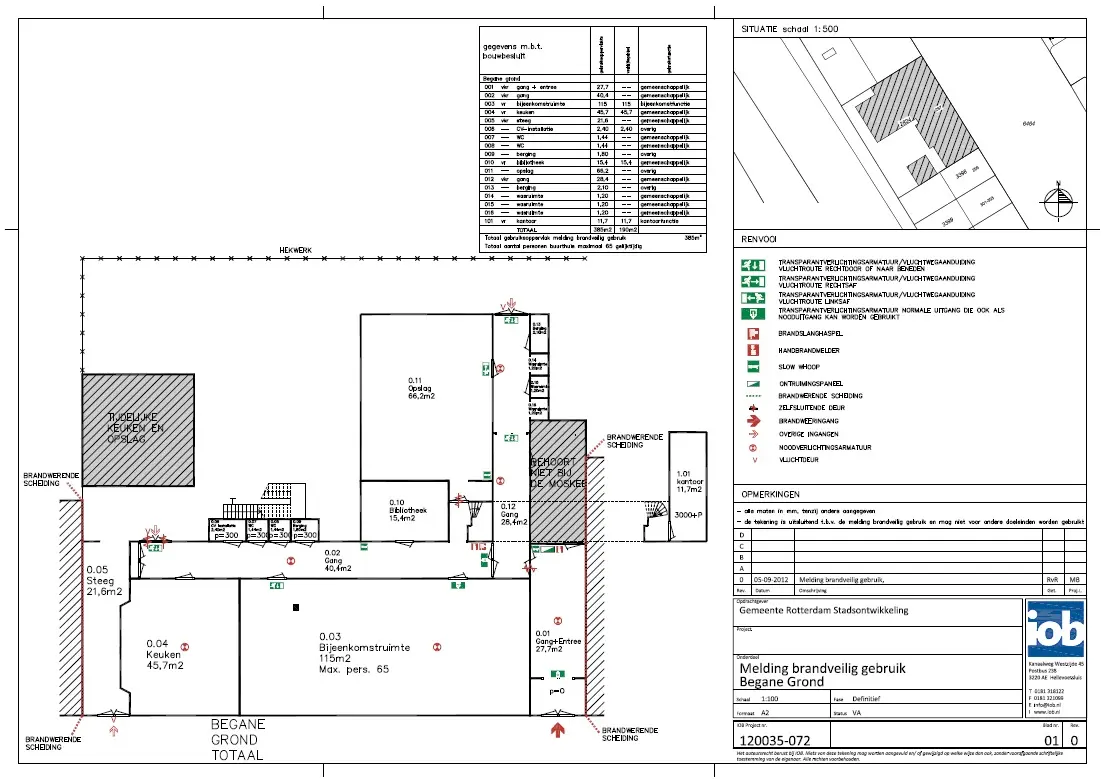 IOB heeft derhalve de tekeningen opgesteld en een melding brandveilig gebruik ingediend via het omgevingsloket. Een melding brandveilig gebruik is noodzakelijk indien meer dan 50 personen gelijktijdig gebruik maken van een bouwwerk.