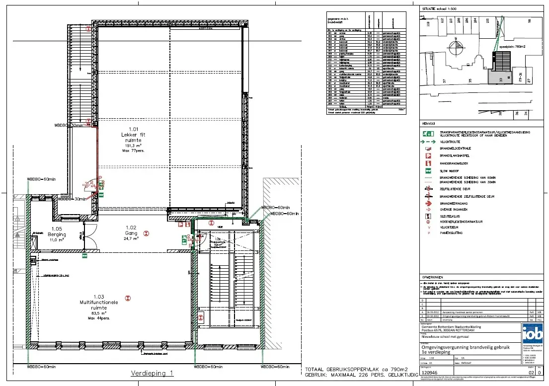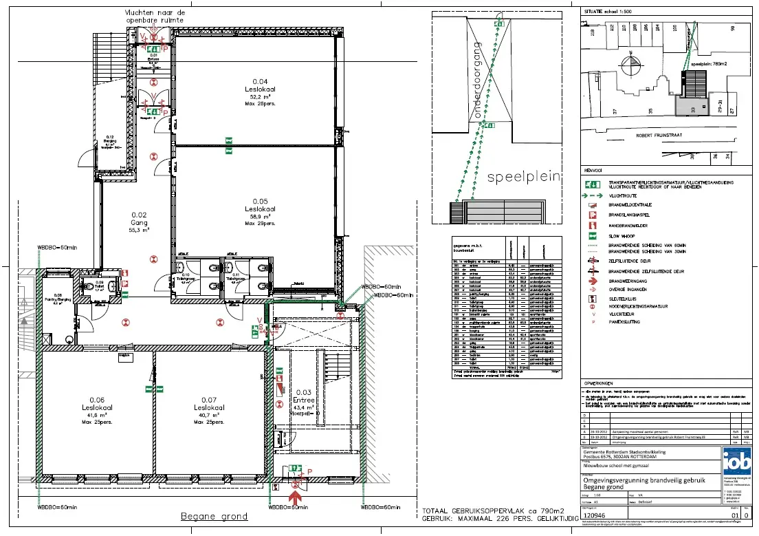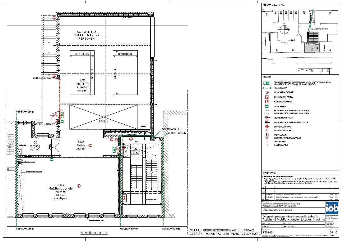 IOB heeft de tekening brandveilig gebruik aan de hand van de uitvoeringstekeningen van de school opgesteld. IOB heeft ook het aanvragen van de omgevingsvergunning brandveilig gebruik via het omgevingsloket.nl verzorgd.