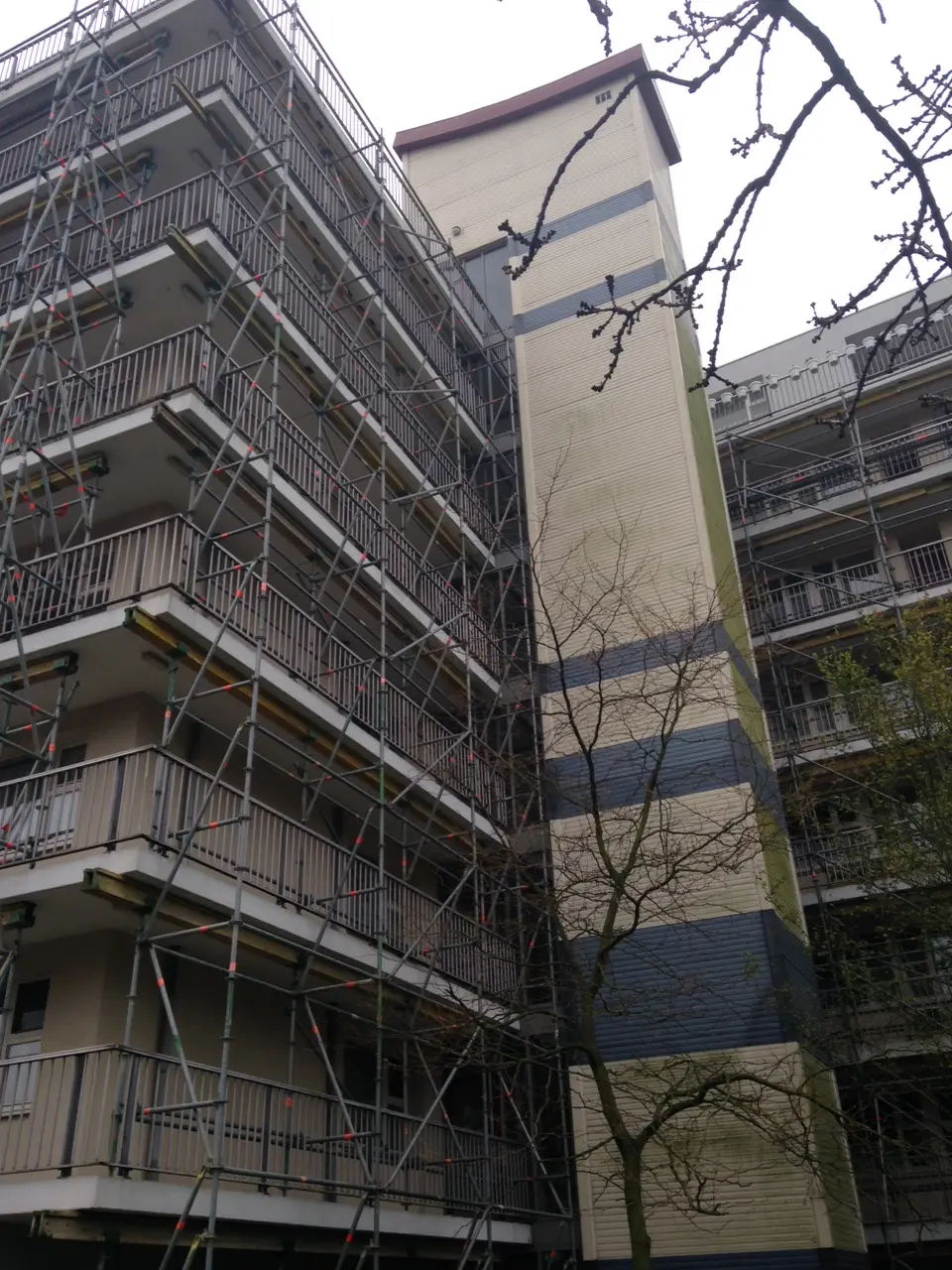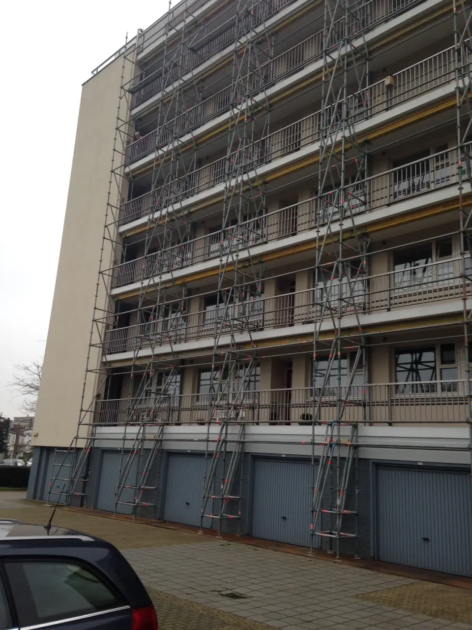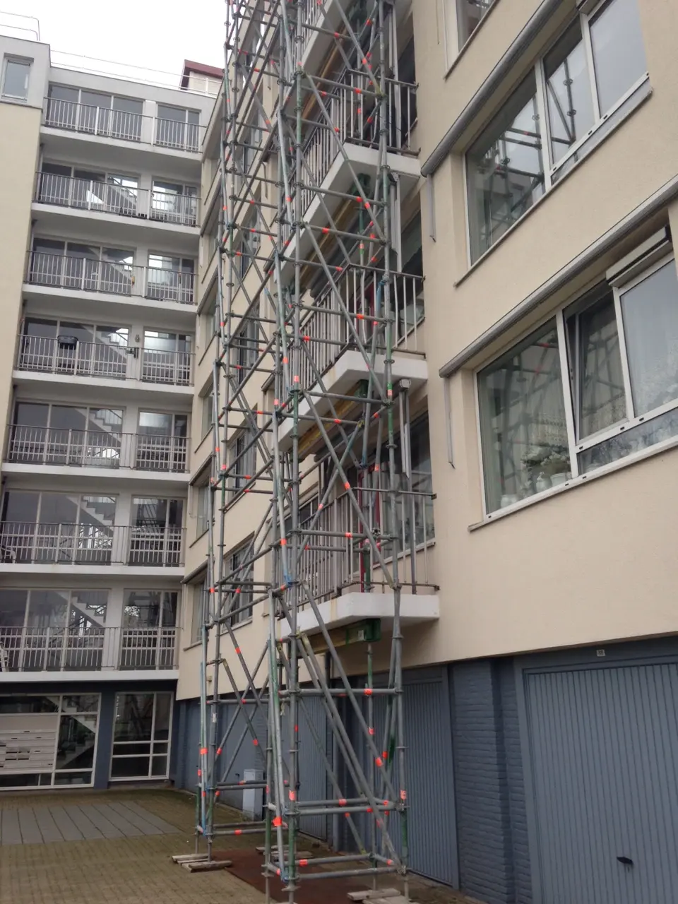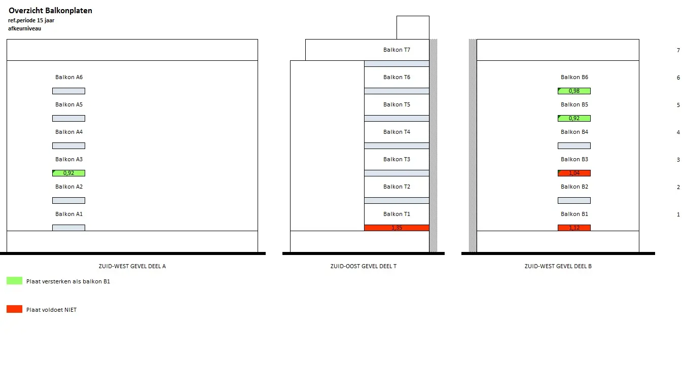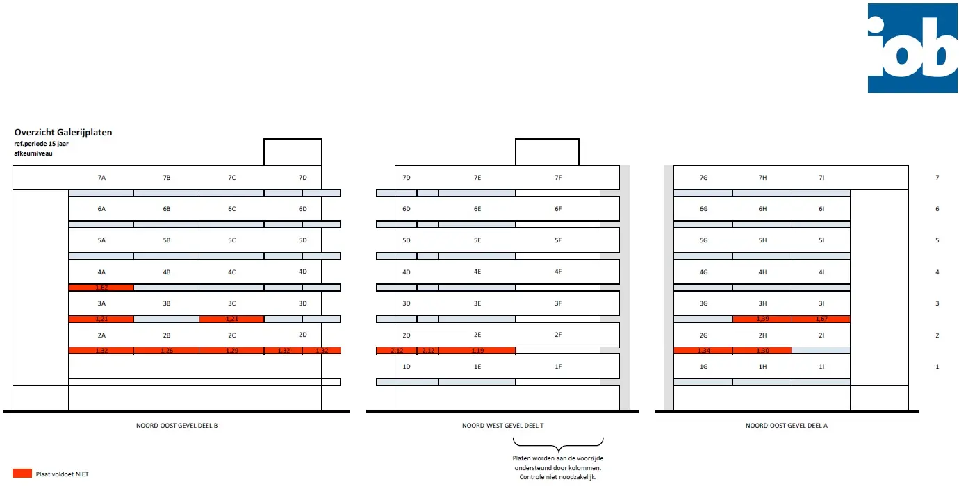Naar aanleiding van een onderzoek naar de constructieve veiligheid van de bestaande balkons en galerijen is aan IOB gevraagd om een second opinion op deze rapportage. Na een controle en interpretatie van het eerste onderzoek zijn aanvullende onderzoeken in het werk uitgevoerd ter verificatie. Hieruit bleek dat de veiligheid van ruim 75% van de galerijen en balkons alsnog voldoet aan de gestelde wettelijke eisen. Een groot deel van de tijdelijke ondersteuning was niet noodzakelijk. Vergelijk hiervoor de foto's met de tijdelijke voorzieningen en de geveloverzichten. In overleg met de opdrachtgever is gekeken naar de locatie en bestaande afwerking van de galerijen en balkons en is voorgesteld de herstelwerkzaamheden uit te voeren met koolstoflijmwapening volgens het VVUV-systeem.