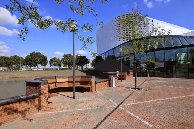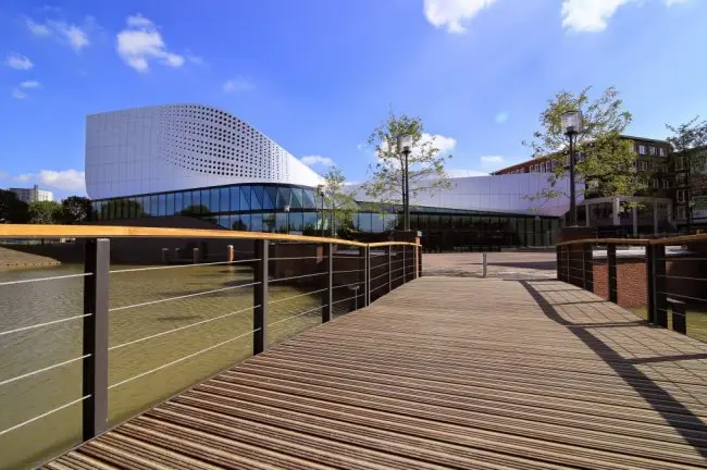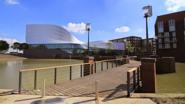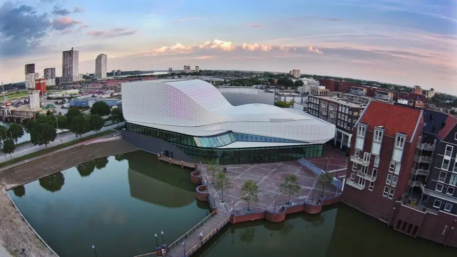 Het ontwerp van het theater is gemaakt door UN Studio naar aanleiding van een prijsvraag in 2008. Het gebouw wordt aan de buitenzijde gekenmerkt door vloeiende, maar ook strakke lijnen en is op een zorgvuldige wijze ingepast in de omgeving. Het gebouw heeft een grote en een kleine zaal waar de bezoekers vanuit de foyer op een vloeiende manier naar toe worden geleid. Het theatercafé aan het water is ontworpen in de vorm van een amfitheater en kan worden gezien als derde zaal. Het project is gerealiseerd door Vorm Bouw B.V.