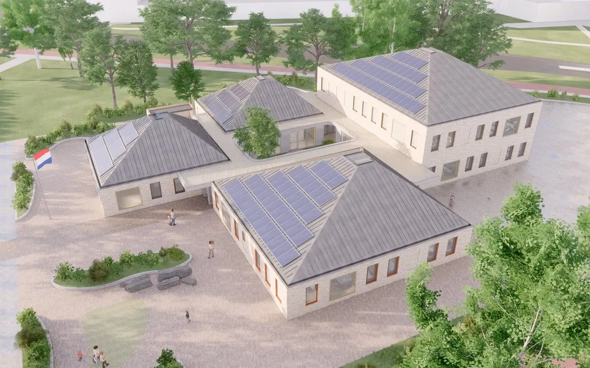 Naast het behalen van de BENG-norm wilde de basisschool in Zwijndrecht nog een stapje verder gaan als het gaat om duurzaamheid en circulariteit. Zo zitten er in het gasloze gebouw twee warmtepompen en liggen er meer dan honderd zonnepanelen op het dak. De puntdaken geven elk huisje een eigen karakter, maar dragen door de vorm ook bij aan een duurzame en energiezuinige installatie, grotendeels gebaseerd op natuurlijke toevoer en warmteterugwinning. Verder ligt er een lagetemperatuurvloerverwarming met een WKO-installatie, heeft het gebouw een hoge isolatiewaarde en zijn er nauwelijks afvalstromen. De luchtkwaliteit wordt met CO2-melders continu gemonitord en ingeregeld. Elk huisje heeft zijn eigen entree en installaties en kan indien nodig ontkoppeld worden en een andere functie krijgen.