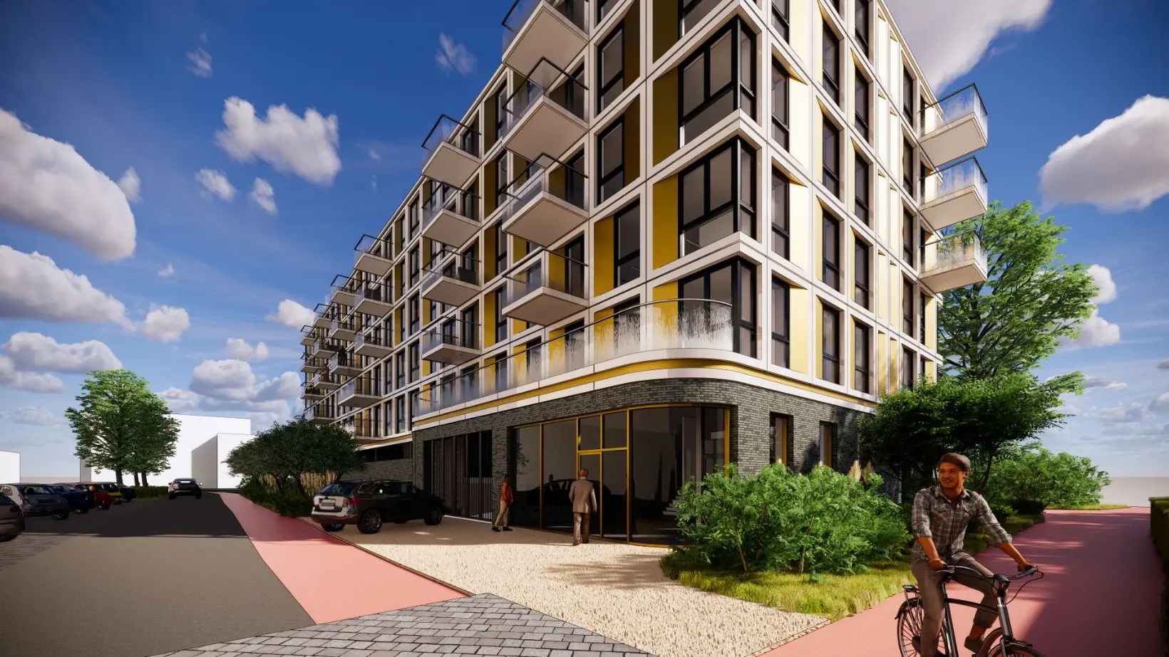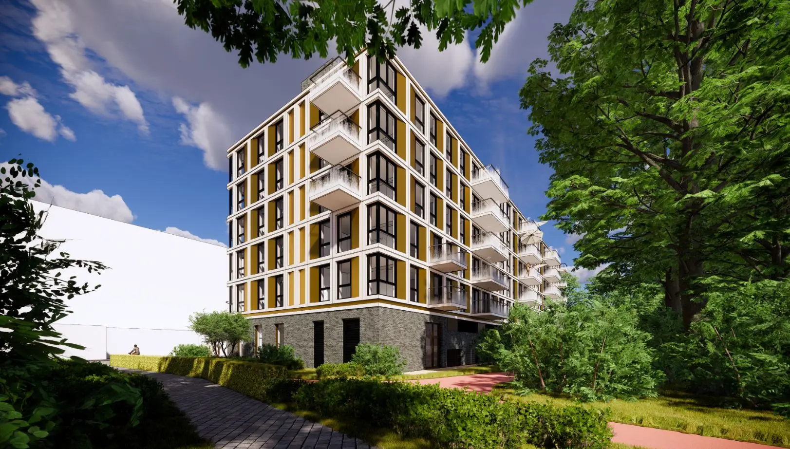 In het plan zal 30 % sociale huur worden gerealiseerd. De opvallende goudkleurige schuingeplaatste metalen delen zorgen voor een mooi contrast en een levendig spel in de gevel. De verdiepte parkeerbak met splitlevel constructie houdt geparkeerde auto’s uit het zicht. Daarmee gaat het gehele gebouw naadloos op in de groene omgeving.
