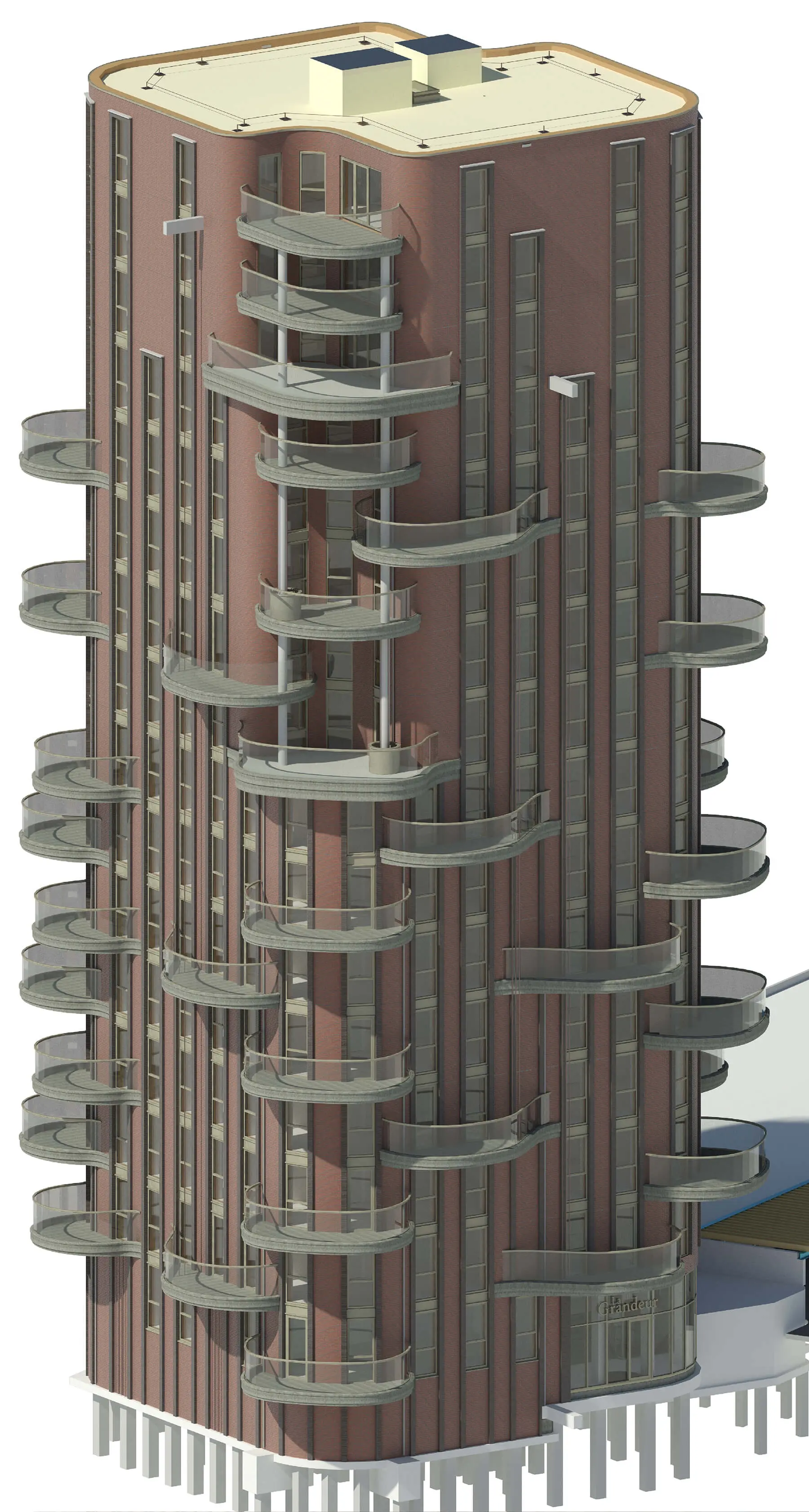 36 appartementen verdeeld over 16 bouwlagen met onderliggende bergingen en aangrenzende parkeergarage